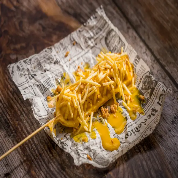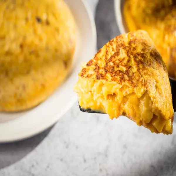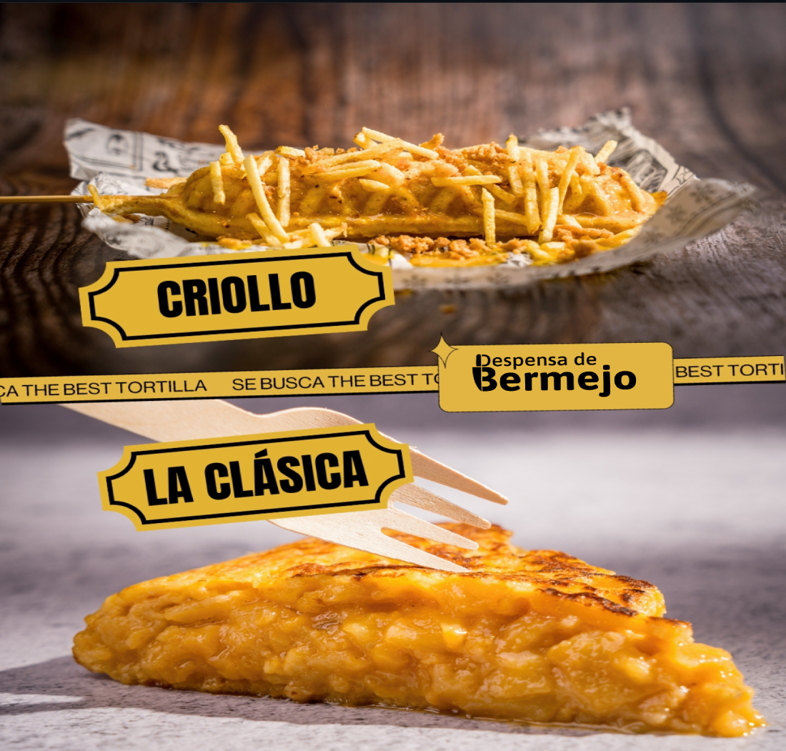 Masa de nuestra tortilla de patata, chorizo criollo, cebolla crispy, patatas paja y salsa de crema de yema de huevo